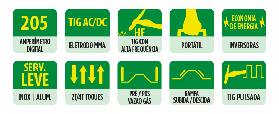 - TIG DC com abertura de arco por HF (alta frequência) e eletrodo revestido (MMA);