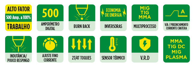 • V.R.D (Dispositivo Redutor de Voltagem): garante que a atenção em circuito aberto seja reduzida para um fator de segurança (abaixo de 32V), proporcionando maior proteção aos operadores e à rede elétrica