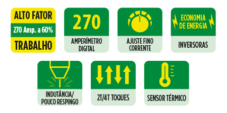 - Máquina Fabricada na China Placas produzidas por robô, em SMD; Alto fator de trabalho – 124 Amp. a 100%; Eletrodo Revestido (MMA) e TIG DC com Lift Arc; Ajuste fino da corrente; Amperímetro Digital; Alça de transporte; Cabo obra com garra negativa de latão injetado; V.R.D – Dispositivo Redutor de Voltagem: garante que a tensão em circuito aberto seja reduzida para um fator de segurança (abaixo de 32V) proporcionando maior proteção aos operadores em relação aos choques elétricos; Sensor térmico (proteção contra superaquecimento); Solda eletrodo revestido da classe AWS e 7018 2,50mm a 100% de ciclo.