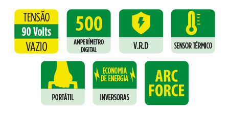 - Tensão em vazio 90V (ideal para soldagem de eletrodos celulósicos e de baixa soldabilidade como o AWS e 6010)