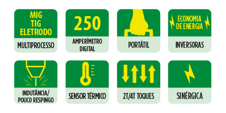 - Multiprocesso MIG pulsada, duplo-pulso, MIG/MAG TIG DC sem HF e MMA
