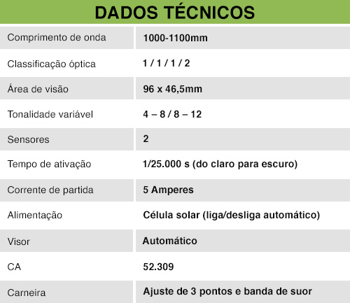 Possui design ergonômico, ajuste de sensibilidade e retardo, modo misto para soldagens de alta intensidade, e sistema de alimentação automática por célula solar com acionamento automático. Atende às normas europeias EN 207:2017 e EN ISO 16321.