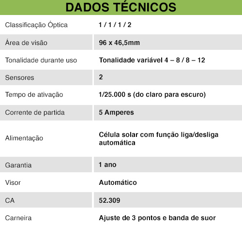 Possui design ergonômico, ajuste de sensibilidade e retardo, modo misto para soldagens de alta intensidade, e sistema de alimentação automática por célula solar com acionamento automático. Atende às normas europeias EN 207:2017 e EM ISO 16321.